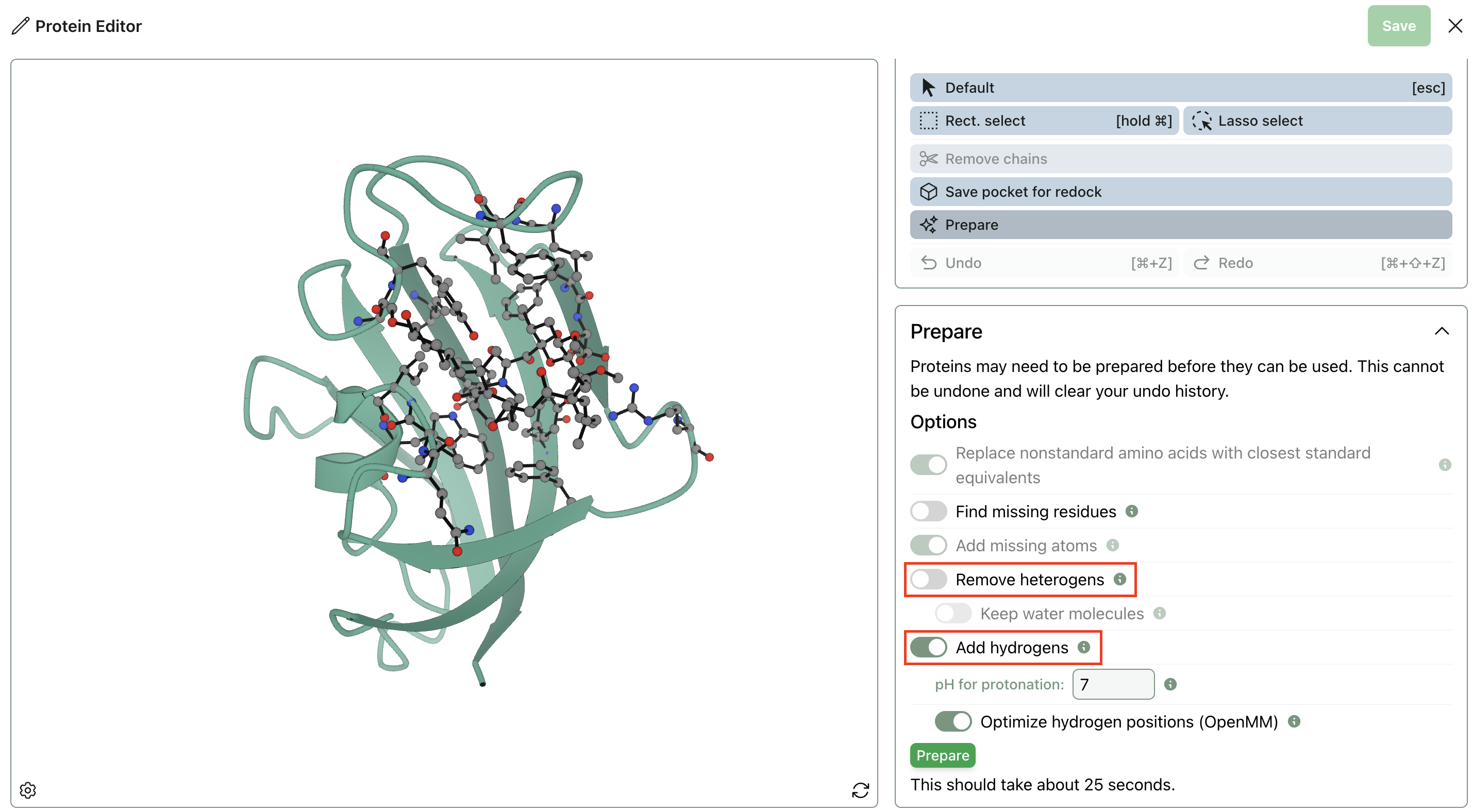 Protein–ligand complexes produced by co-folding jobs may lack hydrogens. To add hydrogens at a given pH to the residues of a protein, use the "Prepare" tool inside Rowan's protein editor. Be sure to deselect "Remove heterogens" so that the bound ligand isn't removed from the complex.